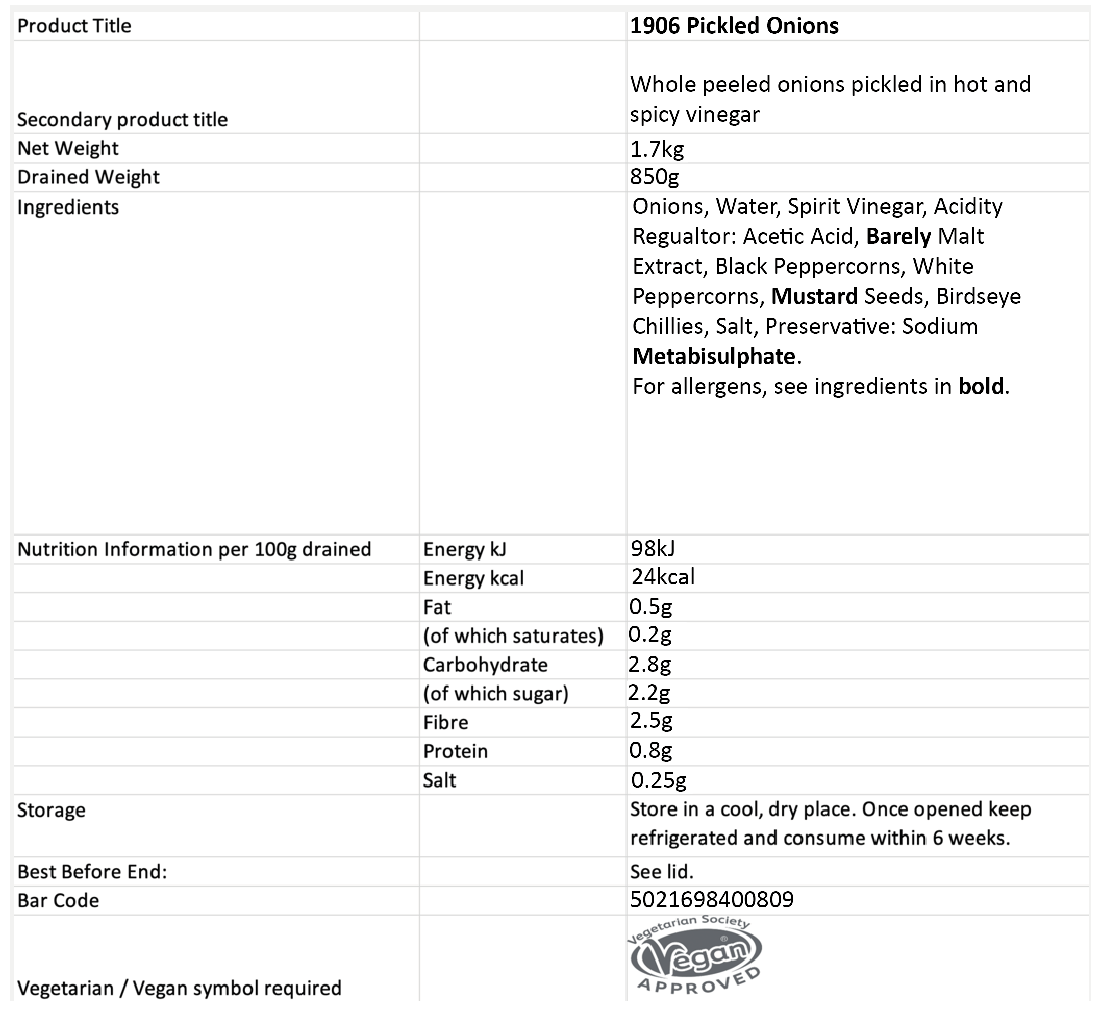 Selected hand peeled onions pickled in the traditional way using the famous Drivers secret vinegar recipe, with added spices for the ultimate pickled onion experience. Best enjoyed with cold meats and cheese.