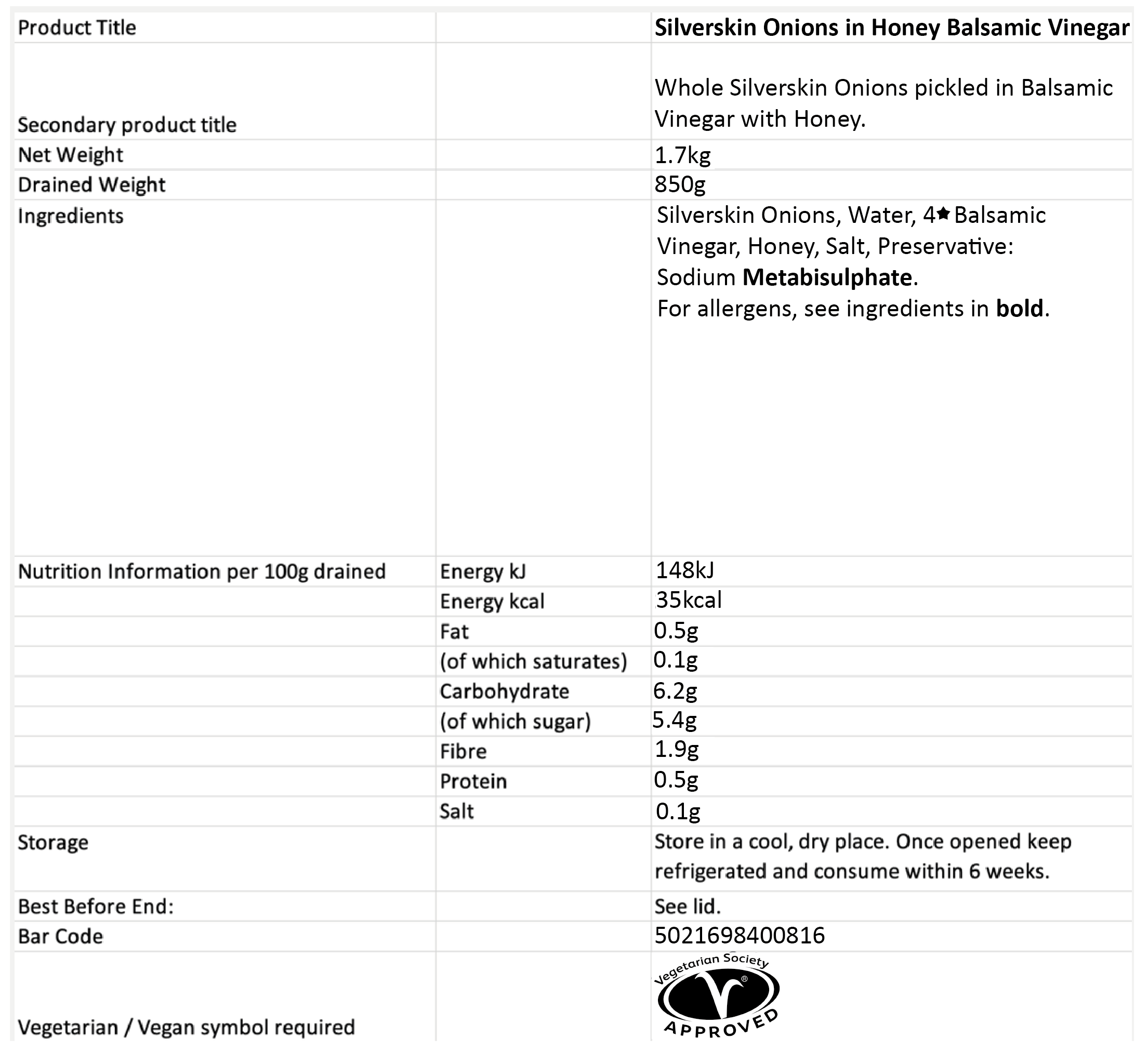 Mini silverskin onions pickled in honey and balsamic vinegar are the ideal accompaniment for cold dishes or can be used as a ready-made cooking ingredient.