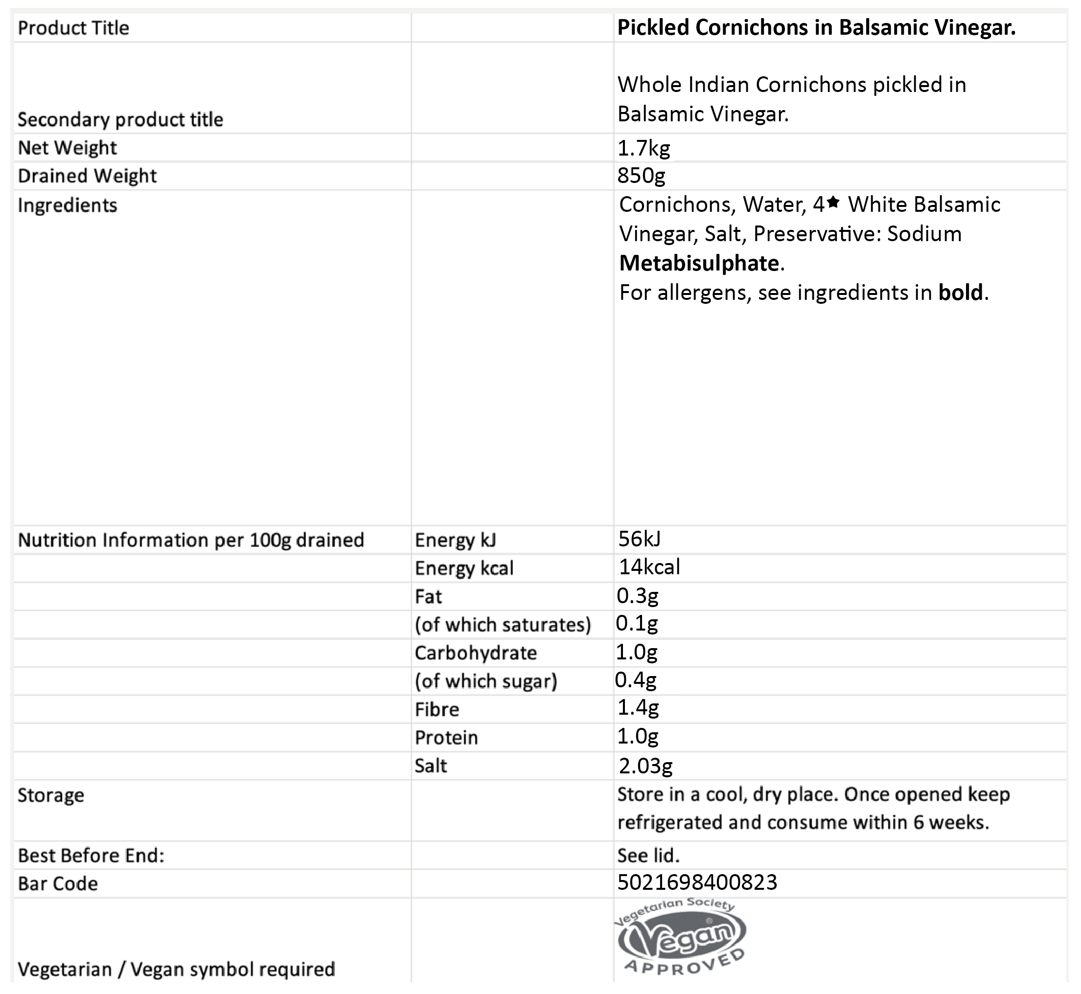 Cornichons (cocktail gherkins) pickled in a sweet white balsamic vinegar are ideal for nibbles at parties, with cold meats and added to salads.